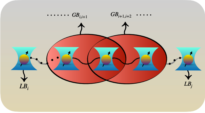 Schematic representation of the effective non-Hermitian Hamiltonian. When the XX model with KSEA interactions between neighboring sites and transverse magnetic fields are in contact with local (LB) and non-local baths (GB), the dynamics can be governed by the effective non-Hermitian model, studied in this work. It leads to a possible method to realize this Hamiltonian in laboratories.