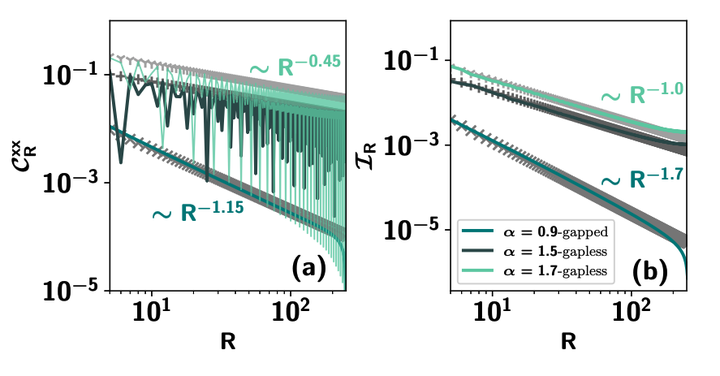Classical correlation and mutual information of the bipartite state obtained from the ground state vs the distance R between two arbitrary sites, i and i + R.